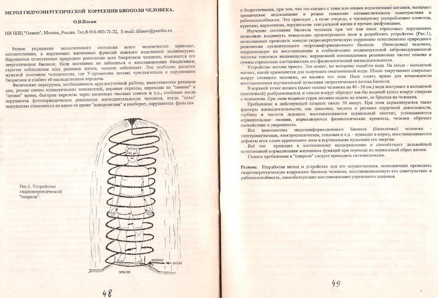 Резюме. Разработан метод и устройство для его осуществления, позволяющие проводить гидроэнергетическую коррекцию биополя человека, восстанавливающую его самочувствие и работоспособность, способствующие восстановлению утраченного здоровья.