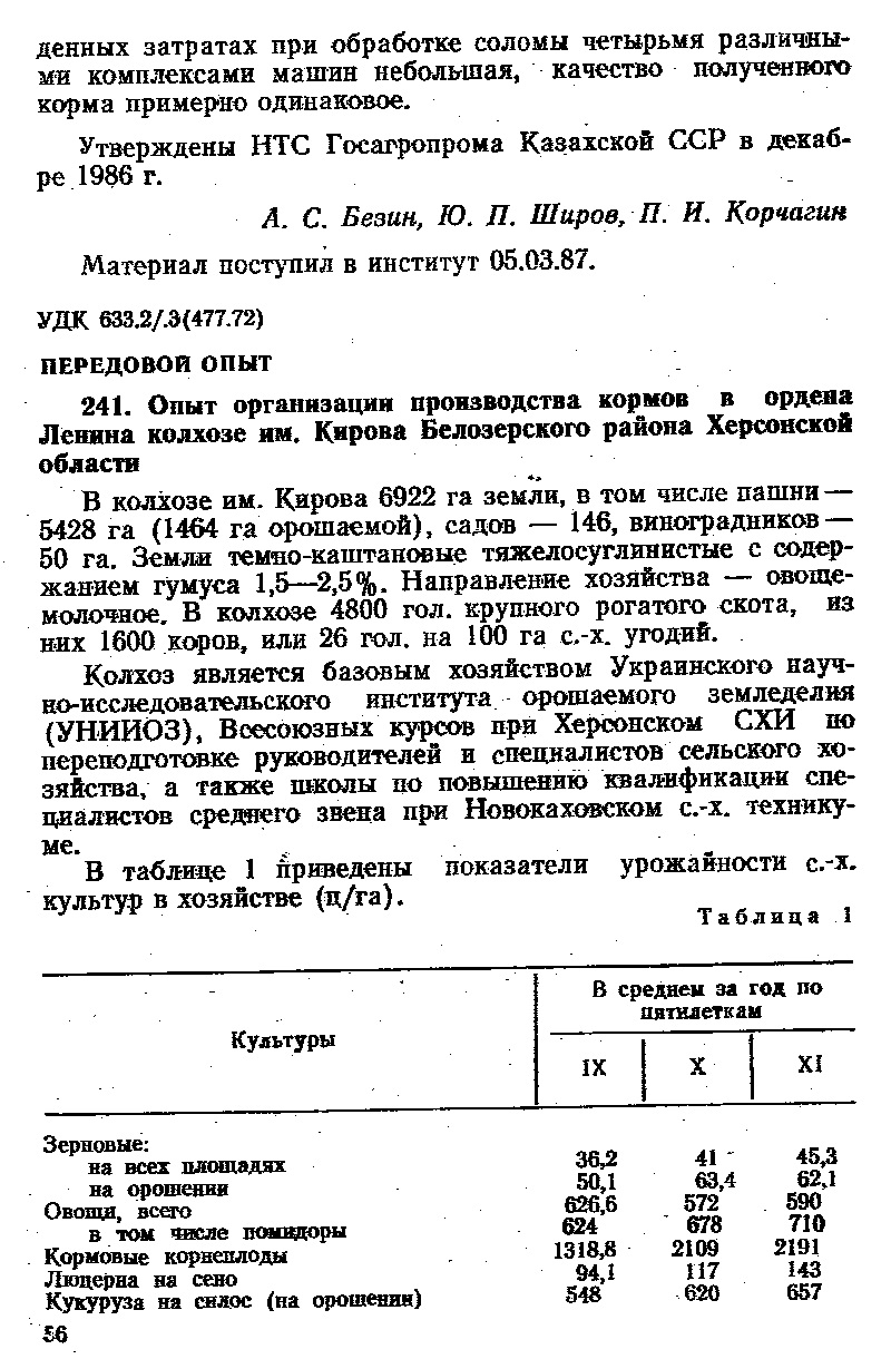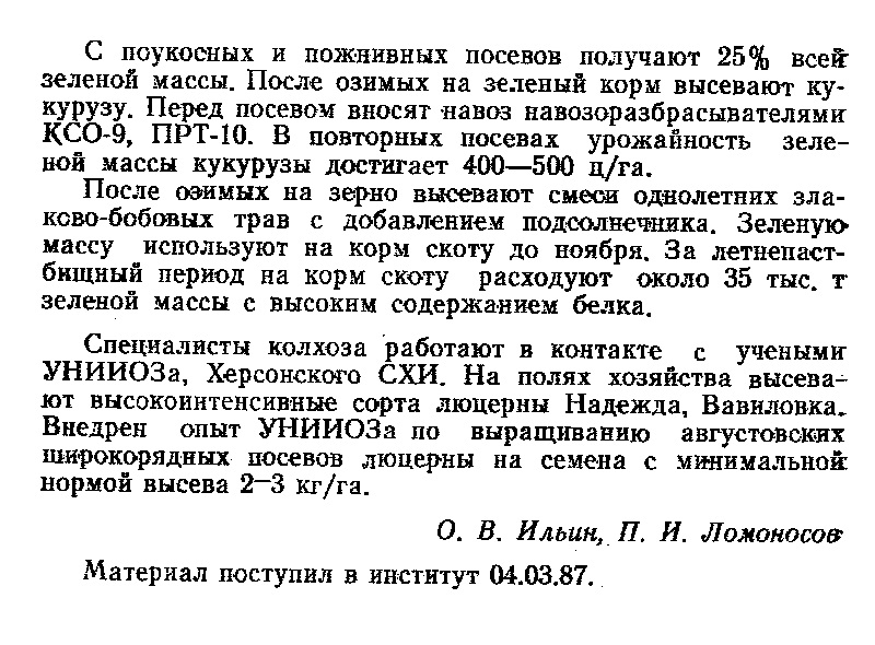 Опыт организации производства кормов в ордена Ленина колхозе им.Кирова